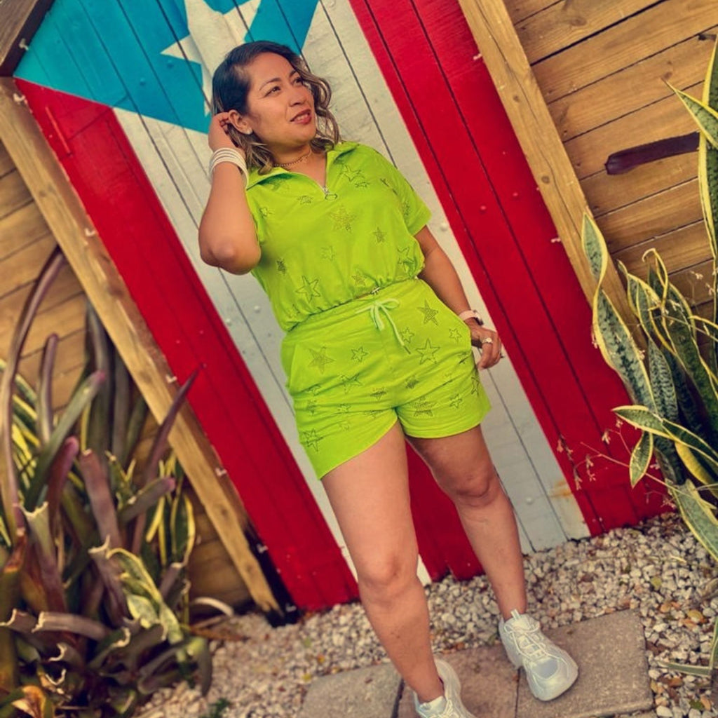 Atrévete a destacar con el Neon Travel Set, un conjunto de dos piezas en tono neón con detalles de estrellas. Su diseño moderno y ligero se adapta perfectamente a tu figura gracias a su ajuste en cintura y mangas.